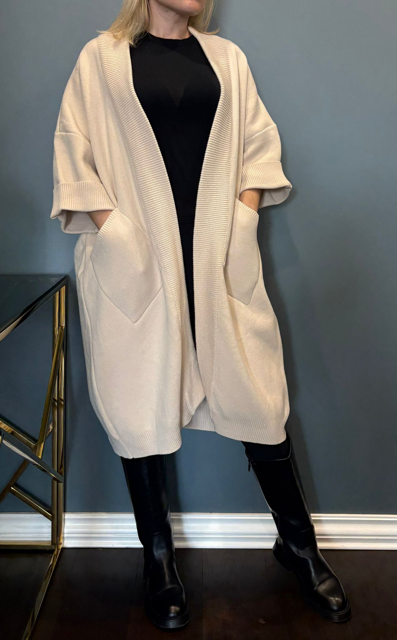 Minkštas, itin šiltas ir jaukus kardiganas, puikiai tinkantis vėsesniems orams. Pagamintas iš malonaus, storo mezgimo audinio, kuris suteikia komforto ir šilumos jausmą visą dieną. Laisvo kirpimo modelis. Lengvai derinamas. Idealus pasirinkimas tiek namams, tiek stilingam rudens ar žiemos įvaizdžiui.