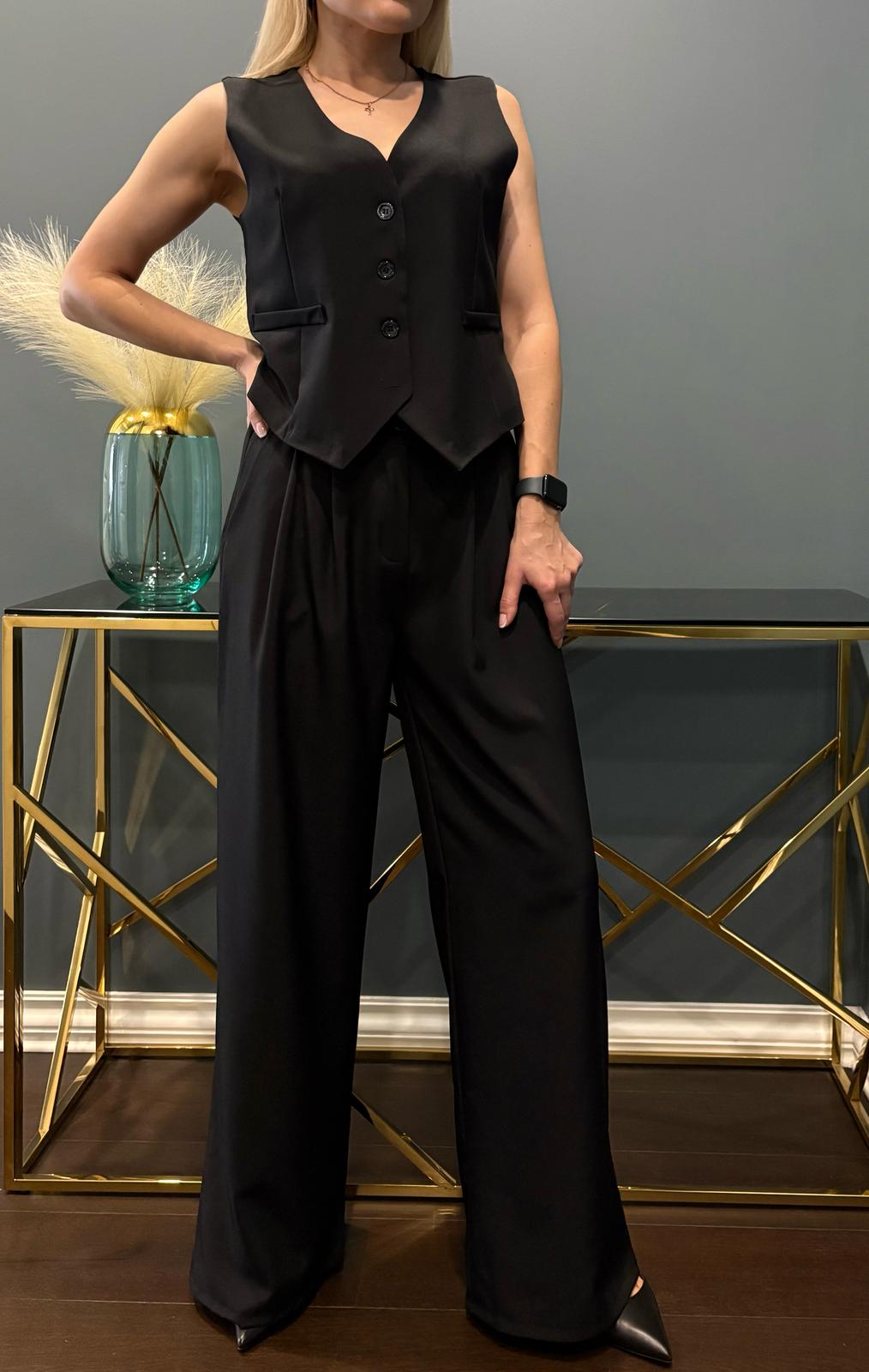 Klasikinis kostiumėlis su liemene – elegantiškas ir stilingas pasirinkimas šiuolaikinei moteriai. Tiesaus kirpimo kelnės ir priderinta liemenė kuria tvarkingą, bet modernų siluetą. Šis kostiumėlis puikiai tinka tiek darbui, tiek stilingoms miesto išvykoms ar vakariniams renginiams.